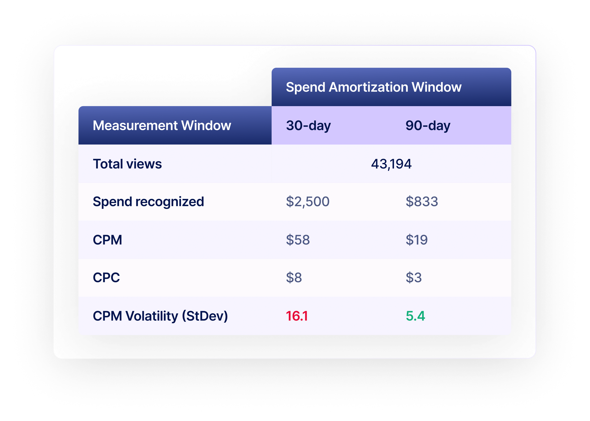- CPM measured using a 30-day amortization window was 3.0x more volatile at day 30